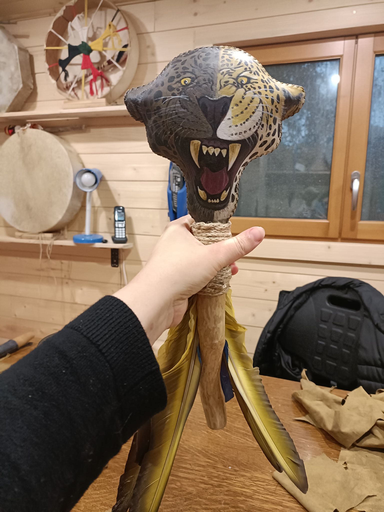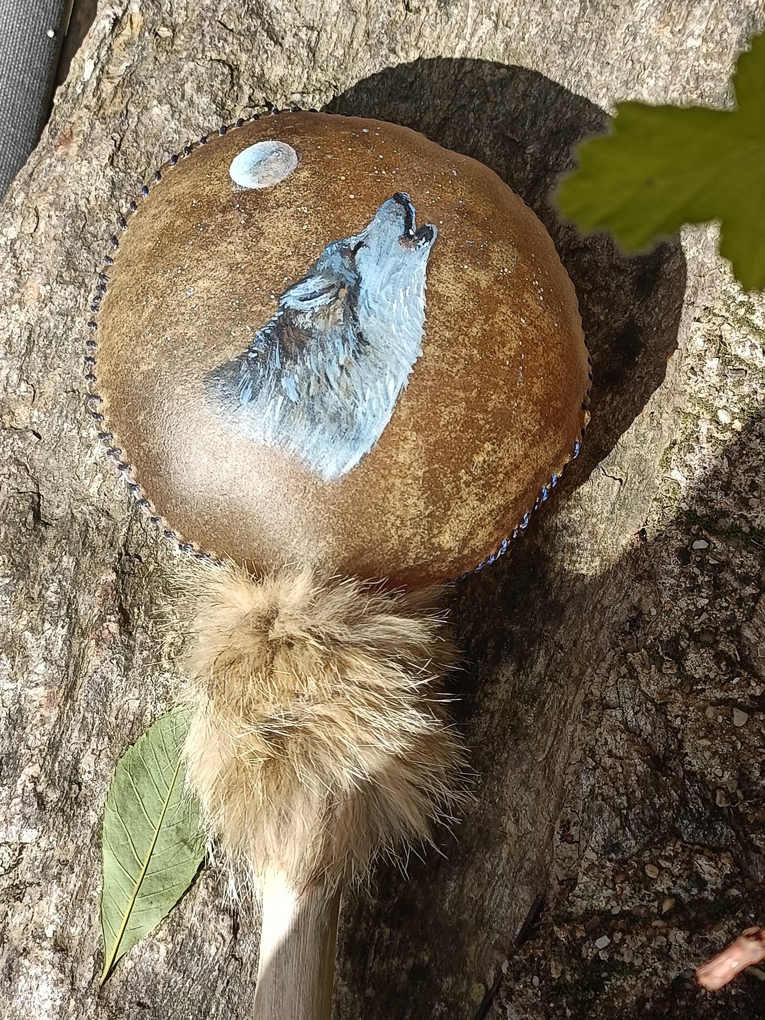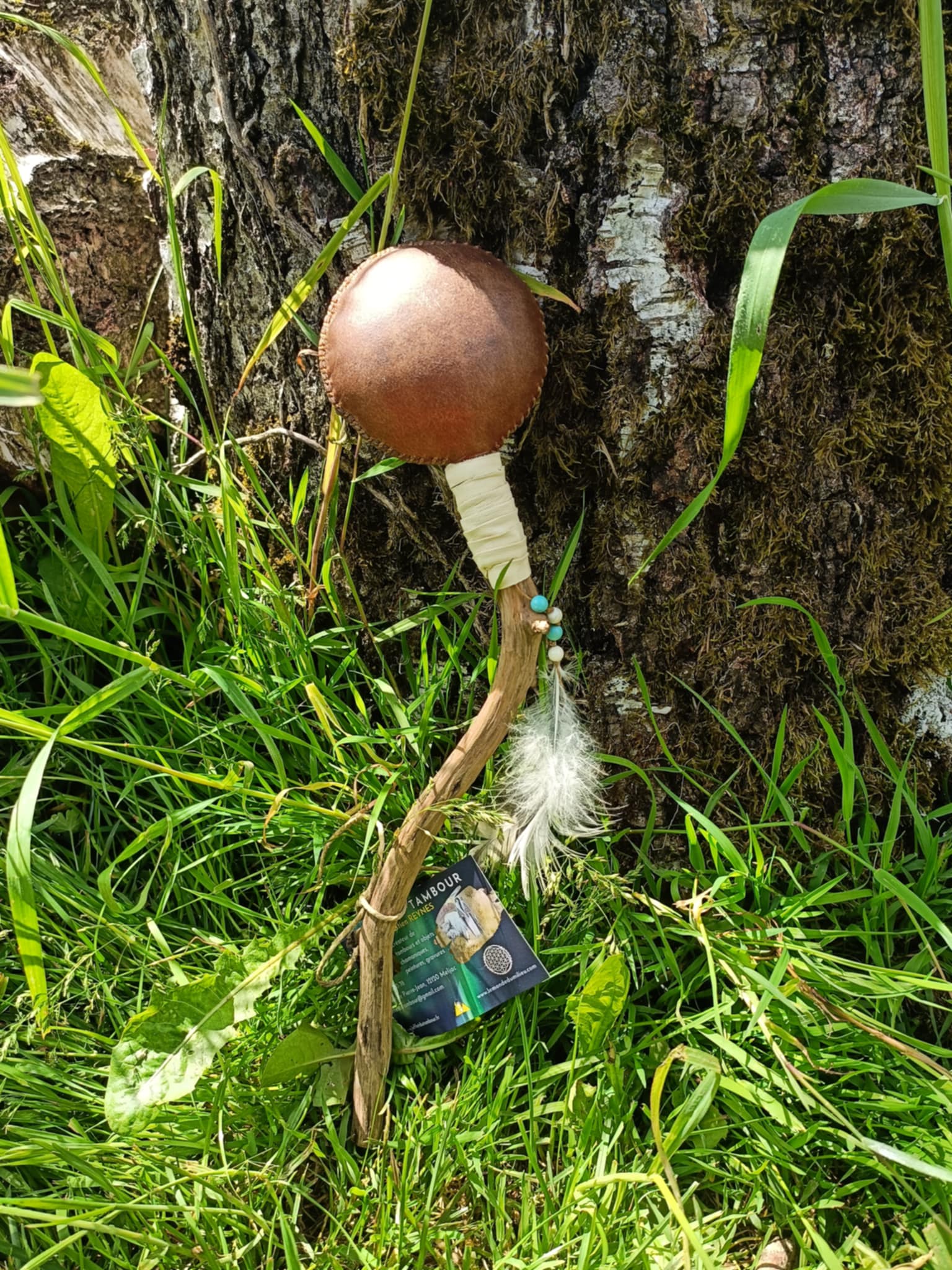 Nous avons réalisé ces mailloches en s’inspirant de la technique des indiennes mapuches d’Amérique du sud. Elles donnent un son plus feutré que la mailloche en peau et sont d’une grand durée de vie.